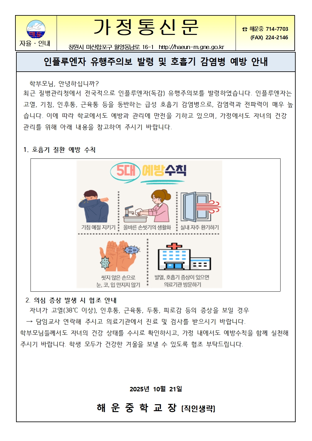 인플루엔자 유행주의보 발령 및 호흡기 감염병 예방 안내